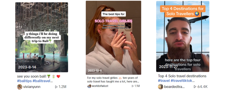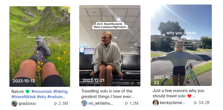 With over 92 million likes for solo travel related content on TikTok, the hashtag #solotravel has seen a tenfold increase in the last three years. The same is true for Instagram, with the hashtag now yielding a total of 9.5 million posts. Creators such as Worldofwlust, Vivianyunn, and Beardedtravels have set out to show the reality of travelling alone, by sharing their ‘top tips’, ‘truths about travelling alone’ but also the locations they have felt safe while solo, itineraries, and things they wish they knew as a first-time traveller.